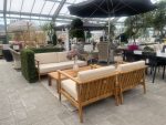 En ekslusiv lounge gruppe i teak bestående av 3-seter sofa, 2 stoler og bord. Møblene har lyse puter i olefin stoff.